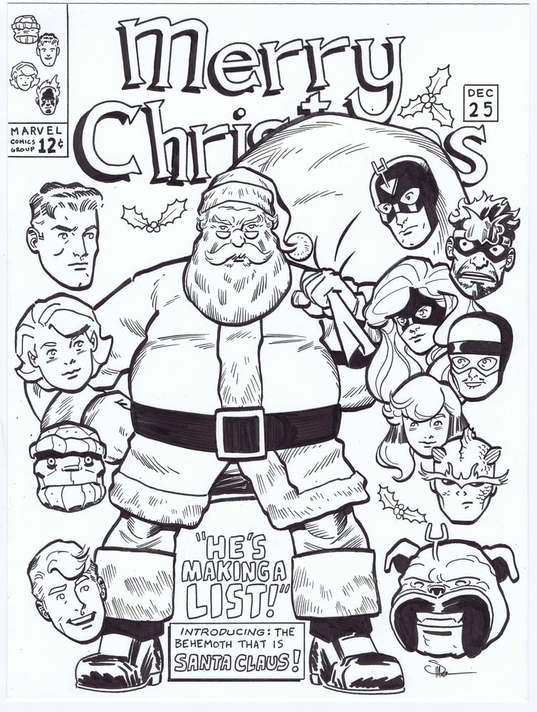 Another older drawing, back when I was drawing something silly for Christmas every year. This is based on Fantastic Four #46 by Jack Kirby and Joe Sinnott, featuring the FANTASTIC FOUR and THE INHUMANS as well as some guy in red.